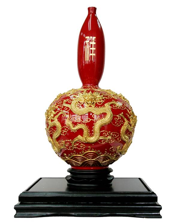 当然,作为一种大众艺术品,作为一种商品、一种礼品,漆线雕是非贴金不可的。金光灿烂,也是我们民族传统的一种社会文化心理与审美取向。然而,由表及里引导消费者入门道欣赏“漆线雕之美”,不但对漆线雕的艺术是一种敬重,同时对消费者的消费也是一种尊重。线条美对于漆线雕的艺术价值是最必须具备的。曾经有工艺美术同行也提议:在当前工艺品批量化生产的时代,漆线雕为何不能压模制作?既可提高效率又能降低成本。这种建议很有道理,也有很多厂家早已如此制作,但是漆线艺术最美的线条感也失去了。大家都有经验,在一块软质材料上压模成形使之表面浮现纹饰很容易做到。不过,这一方法导致所有的纹饰线条都因为模压的工艺局限性显得不够浮凸、不够明晰锐利,远远不能出现漆线直接盘绕重叠产生的强烈凹凸对比和丰富的层次。而这种凹凸浮现、层次垒叠恰恰是漆线艺术最具灵性的美感,非手工制作不能达到。在这方面强调手工制作,强调线条表现绝不是“因陈守旧”的借口,更不是“唯我独尊”地排斥机械先进手段,而是为了坚持漆线雕艺术必须具有的美的灵魂。从蔡氏几代前人在佛像神像的装饰漆线到蔡文沛老艺人在新时代历史人物创作中,从蔡水况先生30几年前首创“龙凤瓶盘”漆线雕到今天“蔡氏漆线雕”的产品以及在历届历次工艺美术大展的获奖作品,一以贯之的就是坚持“线条的艺术”,坚持用线条的语言美来表述这一传统工艺的审美特质。
